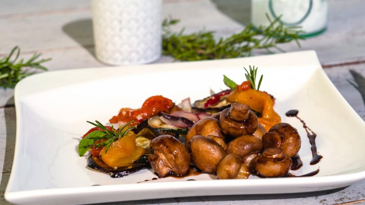 - Die Champignons mit einem Küchentuch von eventuellem Schmutz befreien (nicht waschen). 1 Knoblauchzehe pellen und fein würfeln. Nun 30 ml Olivenöl in einer ausreichend großen Pfanne, mit hohem Rand (ggf. Topf mit großem Ø) erhitzen und die Champignons darin scharf anbraten. Knoblauchwürfel und die restlichen Zwiebelstreifenstreifen zugeben und kurz mit anbraten. Mit dem dunklem Balsamicoessig ablöschen, Temperatur runterdrehen, mit 10 g Zucker, 10 g Salz und 1 g Pfeffer abschmecken. Mit einem Zweig Rosmarin aromatisieren, umfüllen und etwas ziehen lassen.
