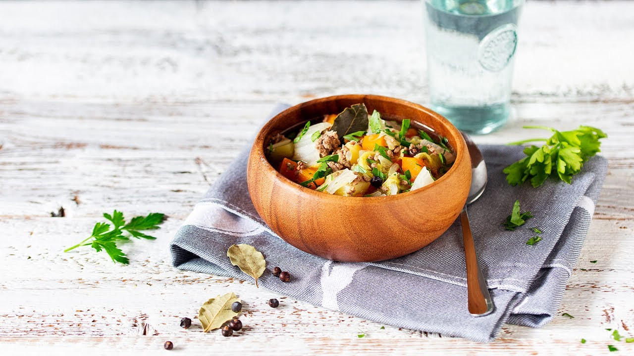 - Öl in einem Topf erhitzen und Hackfleisch darin 5 Minuten krümelig anbraten. Zwiebeln und Knoblauch dazugeben und kurz mitbraten. Mit Brühe ablöschen. Kohl, Karotten, Kartoffeln, Wacholderbeeren, Kümmel sowie Lorbeerblätter ebenfalls dazugeben und alles einmal aufkochen lassen. Hitze herunterschalten und 30 Minuten ziehen lassen. Mit Salz und Pfeffer abschmecken.