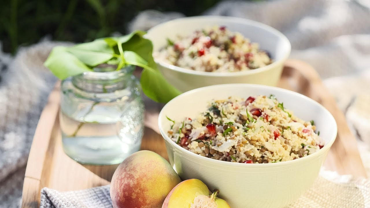 - Die Berglinsen zum Couscous geben, gut durchrühren und mit dem Dressing vermengen.