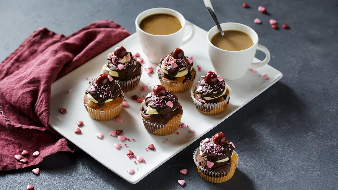 - Kirschen abtropfen lassen und jeweils 3-4 Kirschen pro Förmchen in den Teig drücken, dabei 12 Kirschen für die Deko aufbewahren. Im heißen Ofen 18-20 Minuten backen, auskühlen lassen.