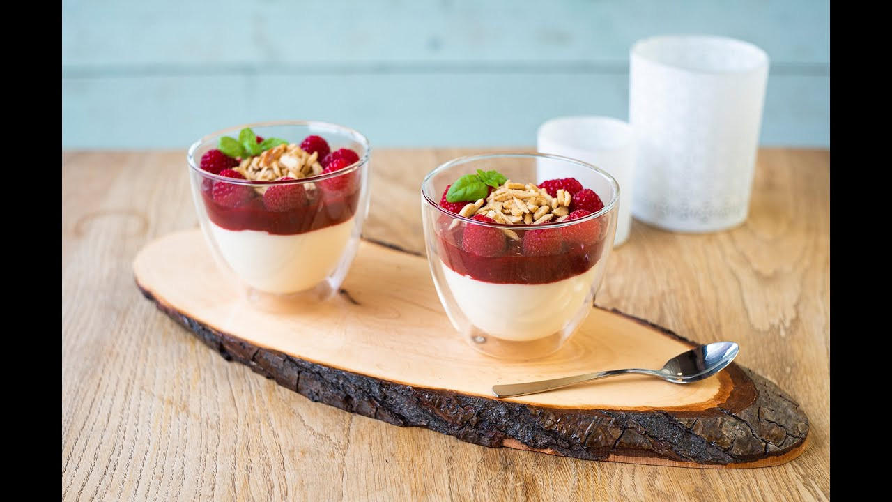 - Für die Eierlikörcrème Frischkäse mit Eierlikör und Zucker glattrühren. Die Sahne aufschlagen und unter die Frischkäsemasse heben. Crème auf vier Gläser verteilen. Himbeerpüree draufgeben und mit den frischen Himbeeren sowie Basilikumblättern garnieren.