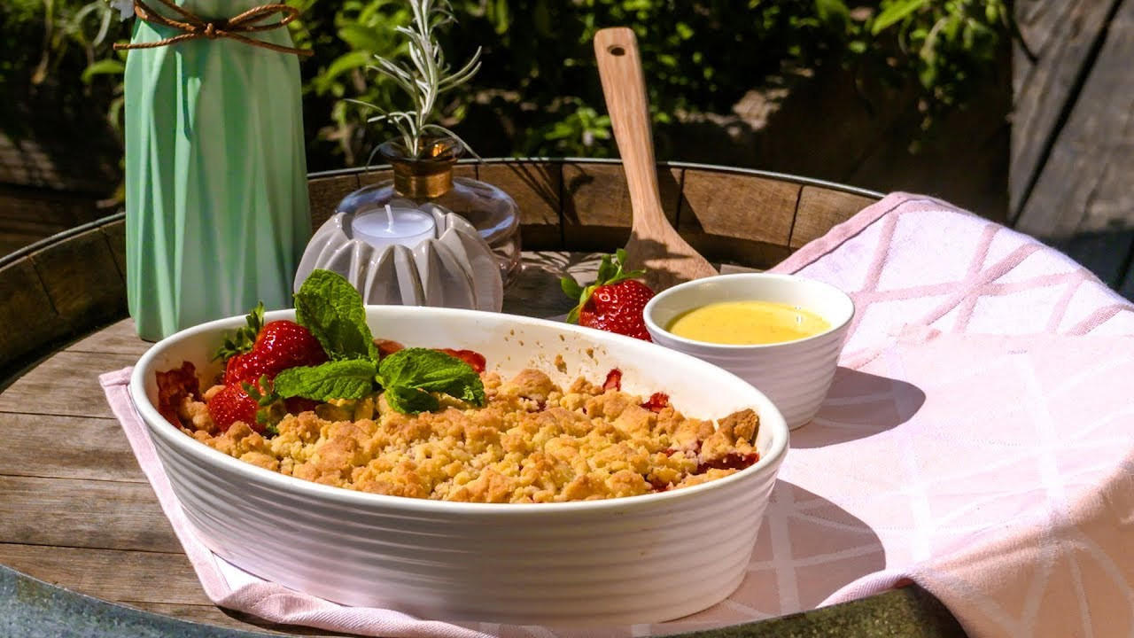 Wie bereite ich Erbeercrumble mit Vanillesoße zu?