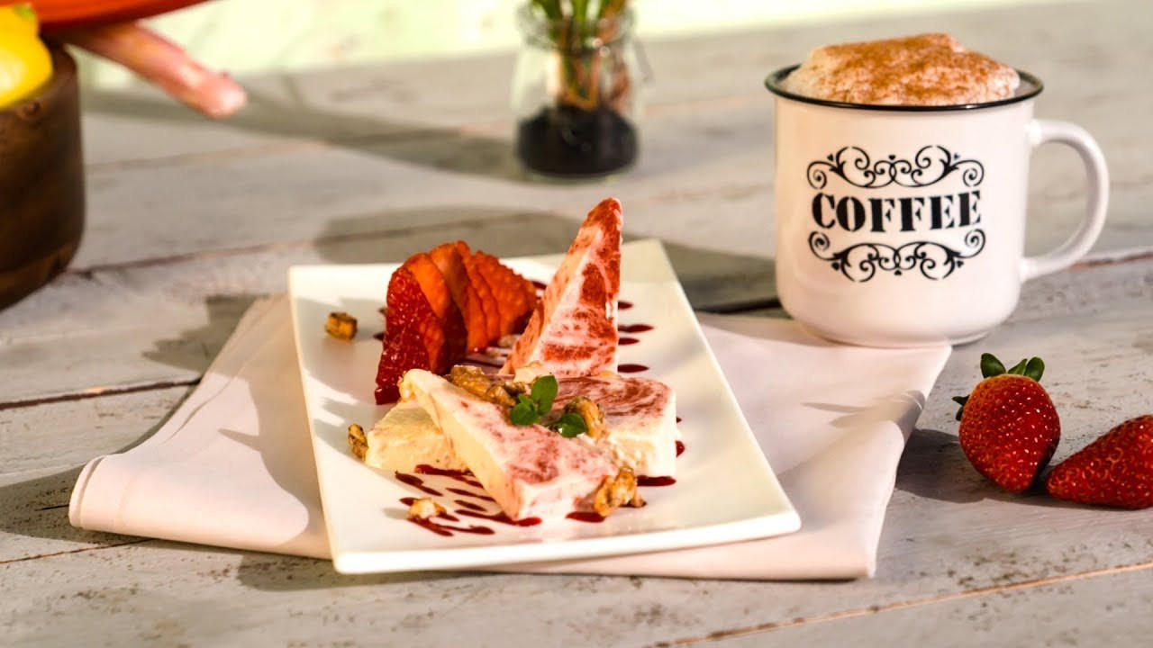 - Das gefrorene Parfait aus der Form stürzen, Folie entfernen und in Scheiben schneiden. Nach Belieben eine oder zwei Scheiben auf einem Teller anrichten und mit 2 EL Erdbeersauce und einem EL Nüssen garnieren und servieren.