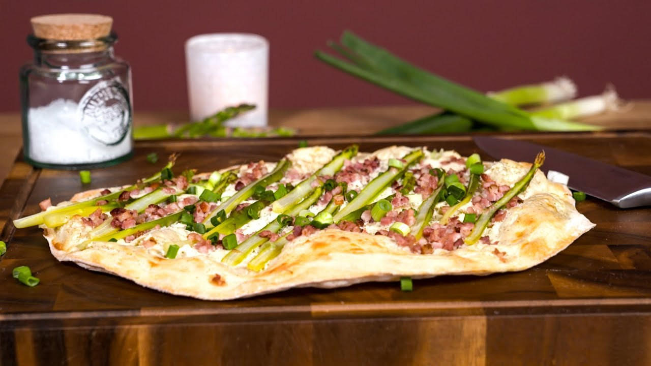 Wie bereite ich Flammkuchen mit grünem Spargel zu?