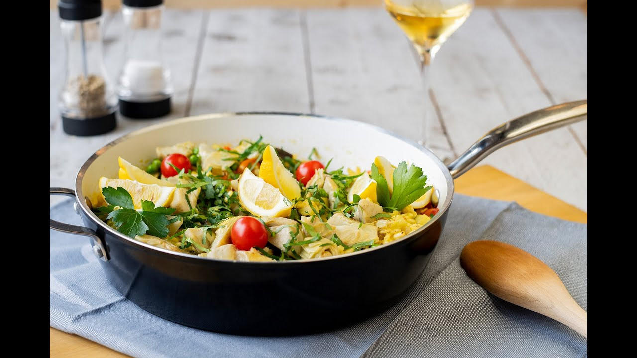 - Vor dem Servieren Petersilie grob hacken, Zitronen in Spalten schneiden und auf der Paella verteilen.