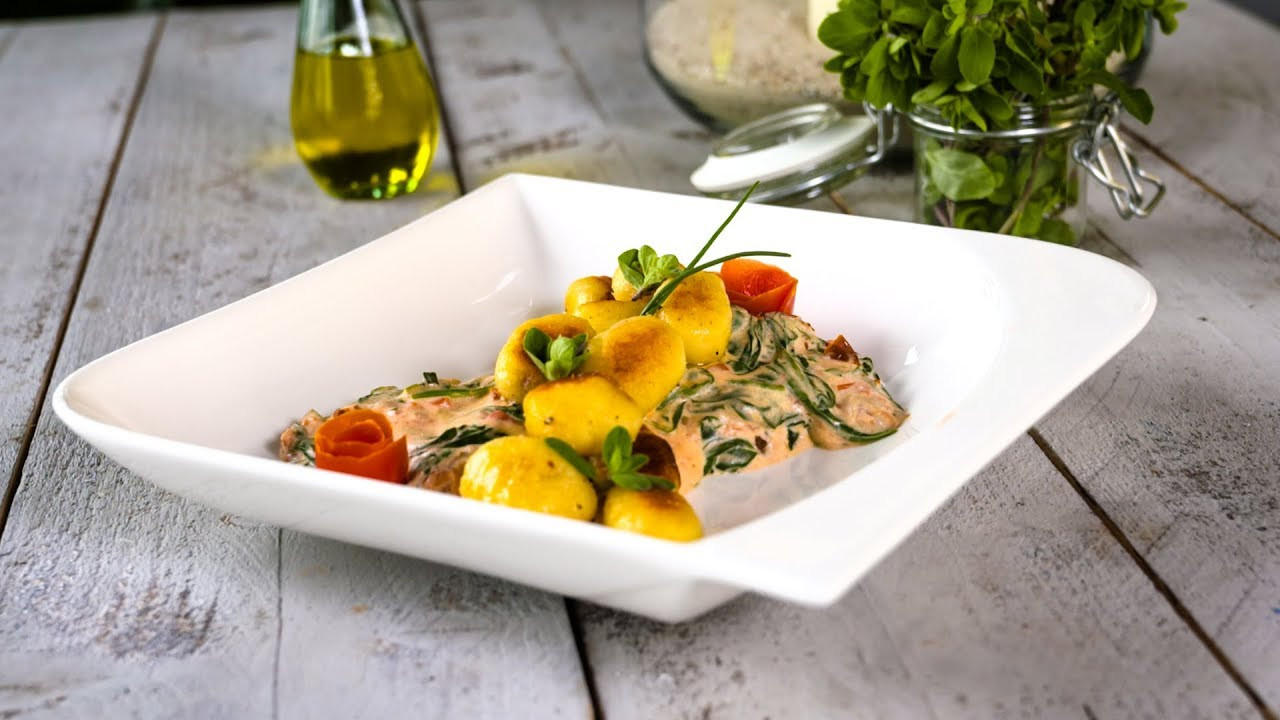 - Nun die knusprigen Gnocchi mit dem Gemüse in einem tiefen Teller anrichten und servieren.