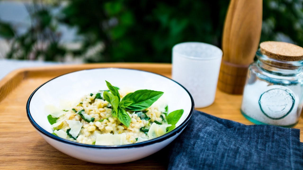 Wie bereite ich das Graupenrisotto mit Spinat zu?