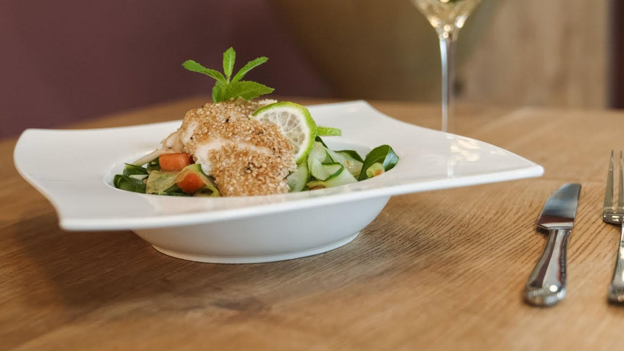 - Den Backofen auf 180 °C Ober-/Unterhitze vorheizen. Hähnchenbrustfilets waschen und trocken tupfen. Rundherum mit Salz und Pfeffer würzen. Sesam in einen tiefen Teller geben und die Filets darin von allen Seiten wenden. Sesam gut andrücken.