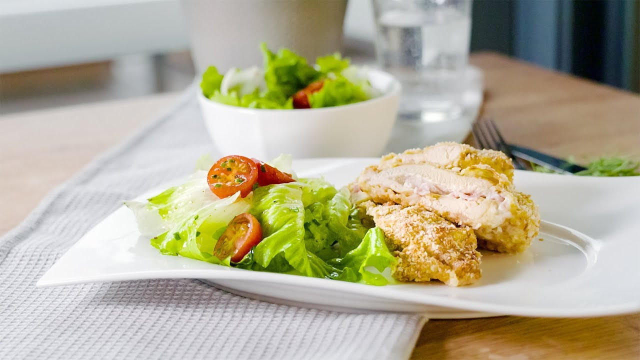 Wie wird das Hähnchen Cordon Bleu mit grünem Salat zubereitet?