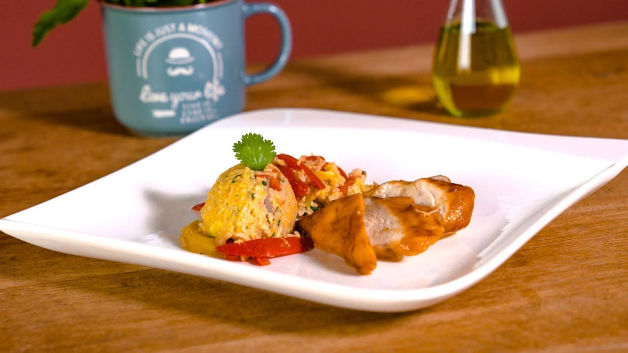 - Nun den Bratreis und das fertig gegarte Hähnchen Teriyaki auf flachen Tellern anrichten und servieren.