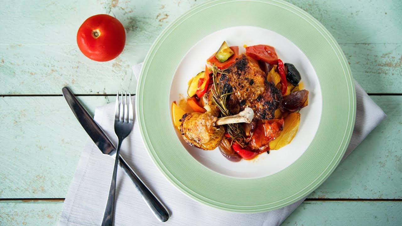 Hähnchenschenkel mit Gemüse aus dem Ofen
