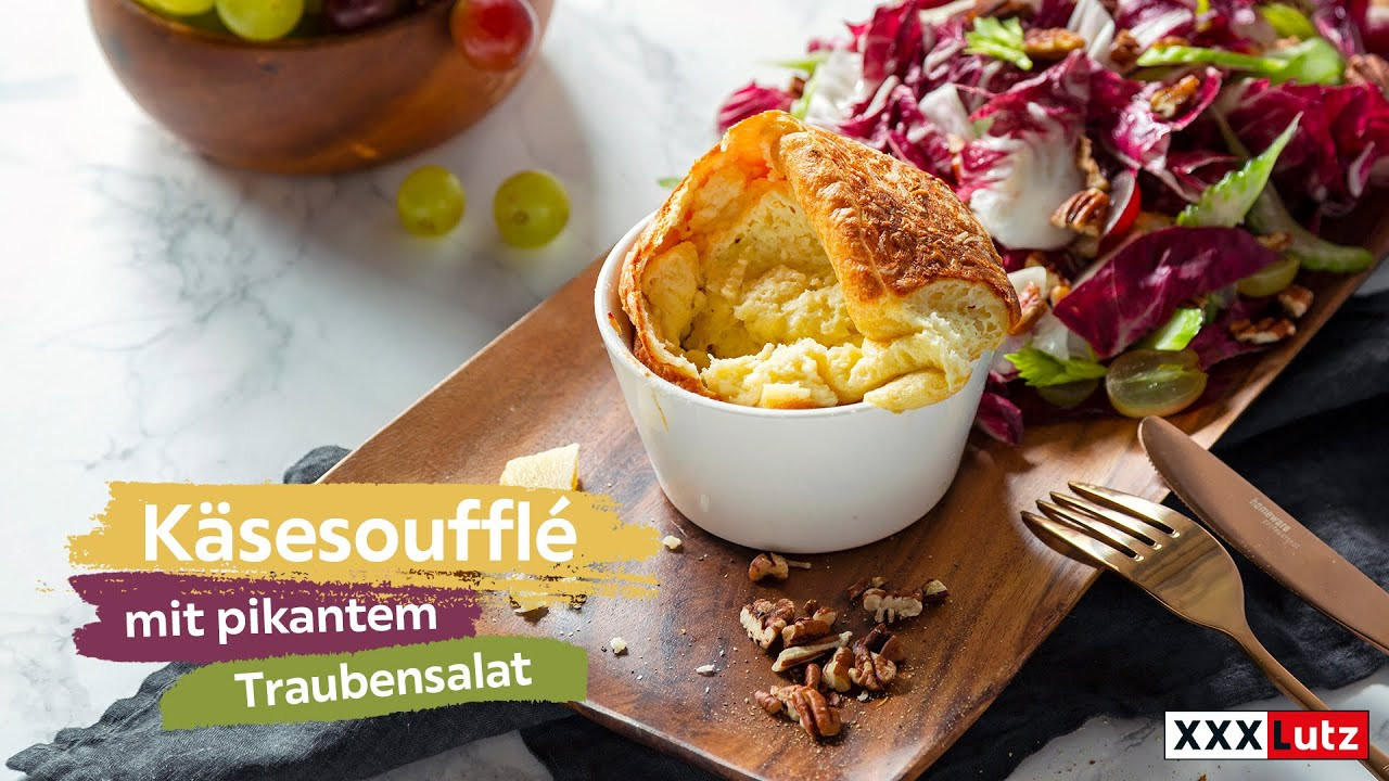 Wie bereite ich Käsesoufflés mit pikantem Traubensalat zu?