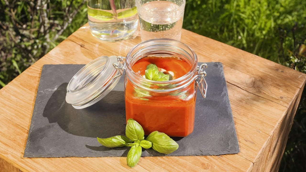 Die Suppe lässt sich auch gut in Weckgläsern mit zum Picknick nehmen, dafür den Joghurt und das Basilikum extra einpacken und erst kurz vor dem Essen zur Suppe geben.