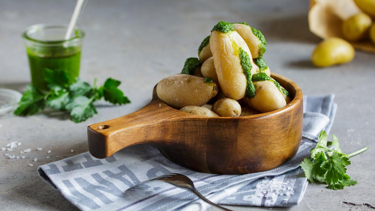- So viel Wasser abgießen, dass der Topfboden gerade eben so mit Wasser bedeckt ist. Hitze herunterschalten und erneut ohne Deckel 5-10 Minuten garen, sodass das Wasser verdunsten kann. Kartoffeln immer wieder umrühren, damit sie nicht anbrennen und gleichmäßig mit der Salzkruste überzogen werden. Mit Mojo Verde servieren.