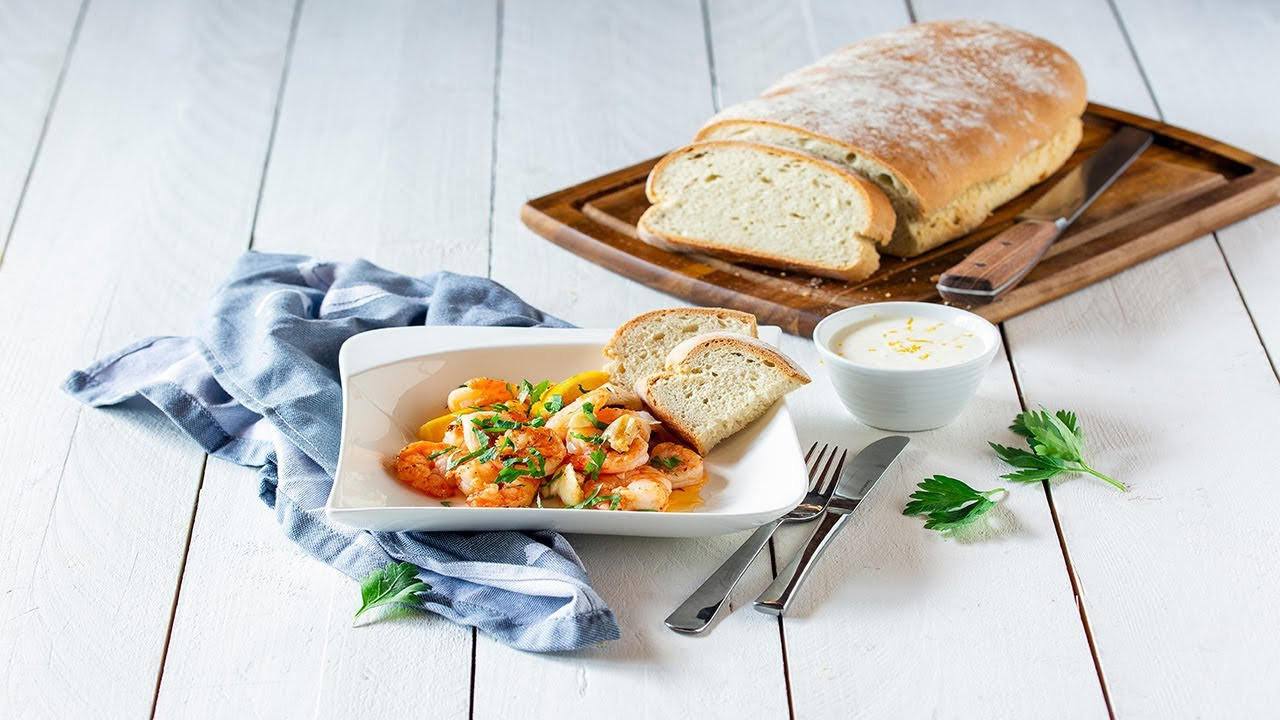 Knoblauchgarnelen mit Blitzbrot und Zitronenmayonnaise