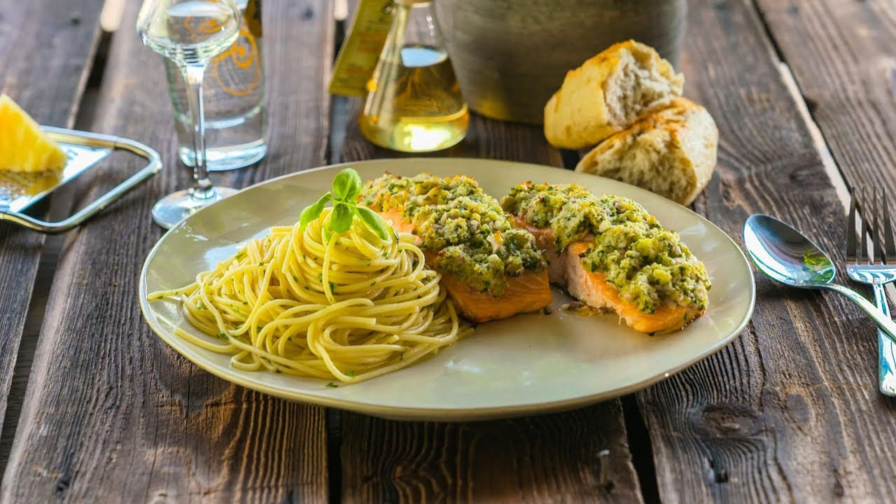 - Währenddessen Salzwasser zum Kochen bringen und Spaghetti al dente kochen. Parallel eine Pfanne erwärmen und Butter bei niedriger Temperatur schmelzen lassen. Spaghetti in die Pfanne geben und mit Salz, Zitronenabrieb/-saft abschmecken. Mit gehackter Petersilie verfeinern und mit Lachsfilets servieren.