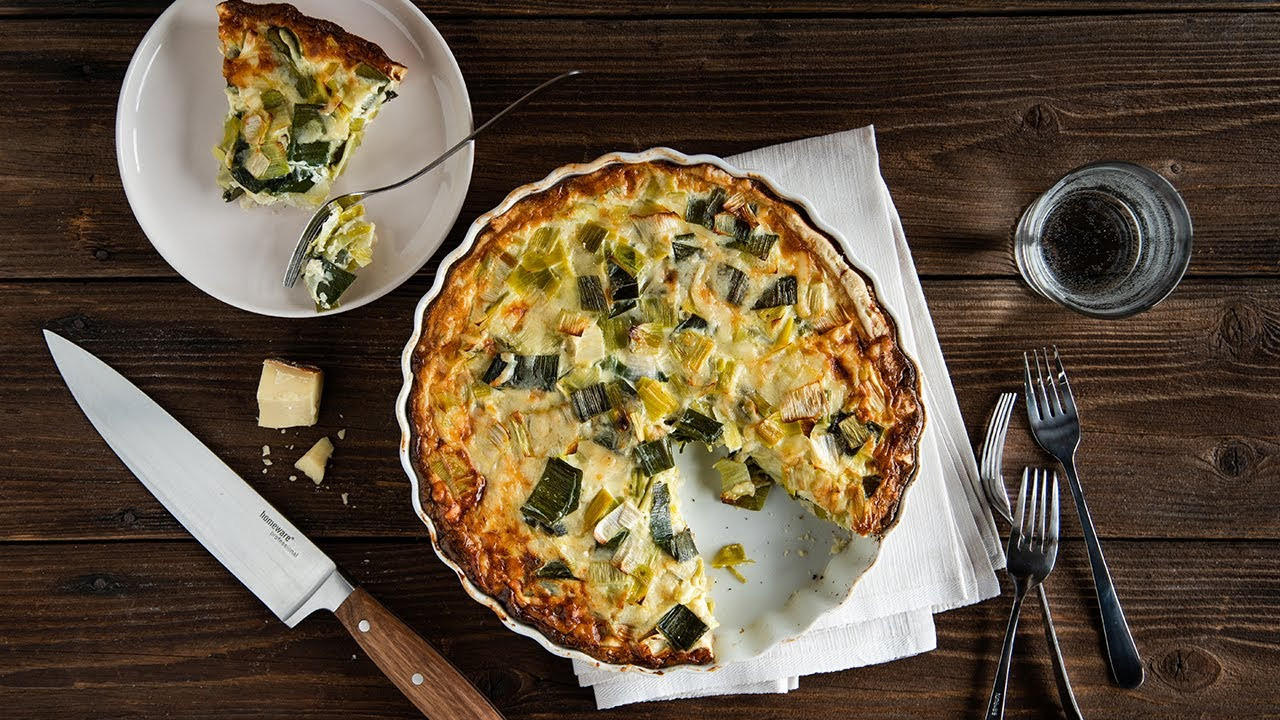 - Währenddessen Eier mit Milch und Crème fraîche verquirlen. Gruyère grob reiben und mit dem Lauch unter die Eimasse rühren. Mit Salz, Pfeffer und Muskatnuss abschmecken.
