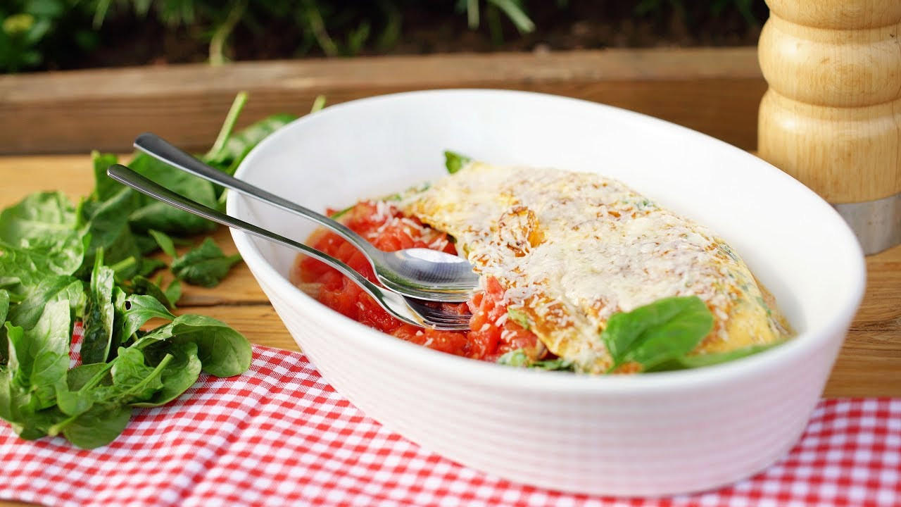 - Spinat und Tomaten auf die Omeletts geben, nun je die Hälften überklappen. Die Tomatensoße in eine große Auflaufform (alternativ in 2 kleine Auflaufformen) geben. Die Omeletts darauf setzen. Mit dem Parmesan bestreuen. Im heißen Ofen in etwa 3 Minuten gratinieren. Aus dem Ofen nehmen und servieren.