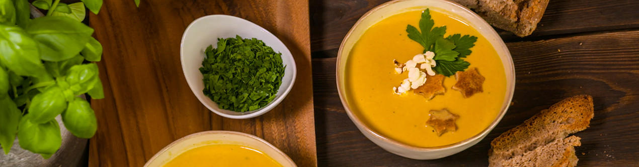 - Suppe auf Suppentellern anrichten und Knuspersterne darauf verteilen.