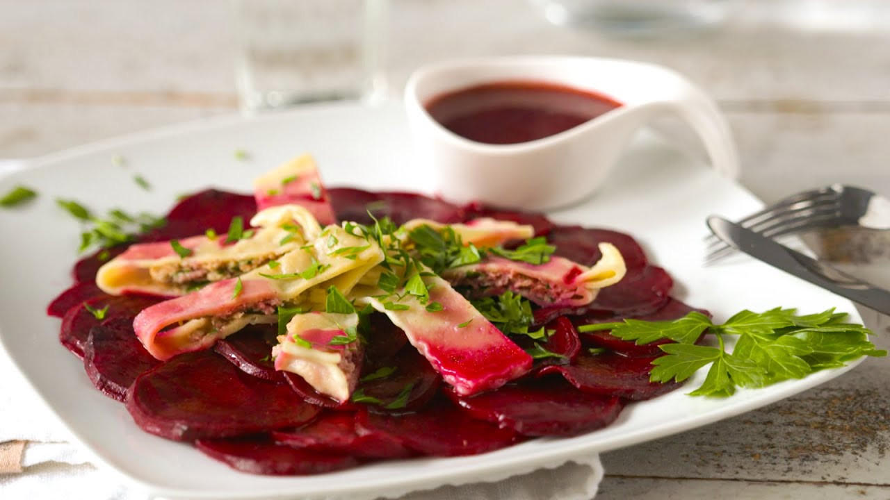 Maultaschensalat auf Rote-Beete-Carpaccio