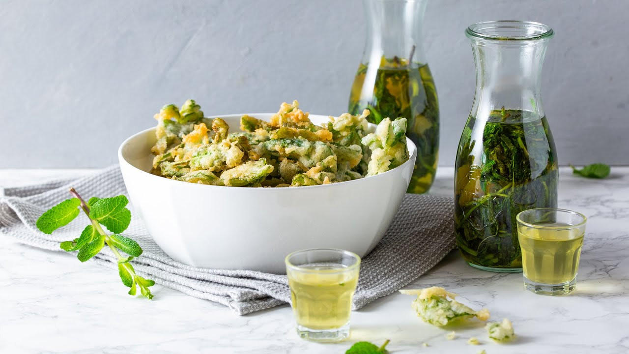 - Öl in einem Topf auf 170 °C erhitzen. Minze durch den Teig ziehen und im heißen Fett kross ausbacken. Auf Küchenpapier abtropfen lassen.