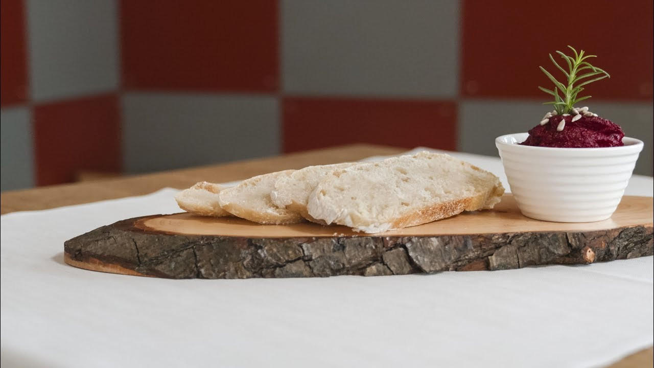 - In der Zwischenzeit den Aufstrich herstellen. Dafür die Rote Bete grob in Stücke schneiden. Zusammen mit den Sonnenblumenkernen, Meerrettich, Essig, Zitronensaft und Öl in einen Standmixer geben und cremig pürieren. Mit Salz und Pfeffer abschmecken und zum Brot servieren.