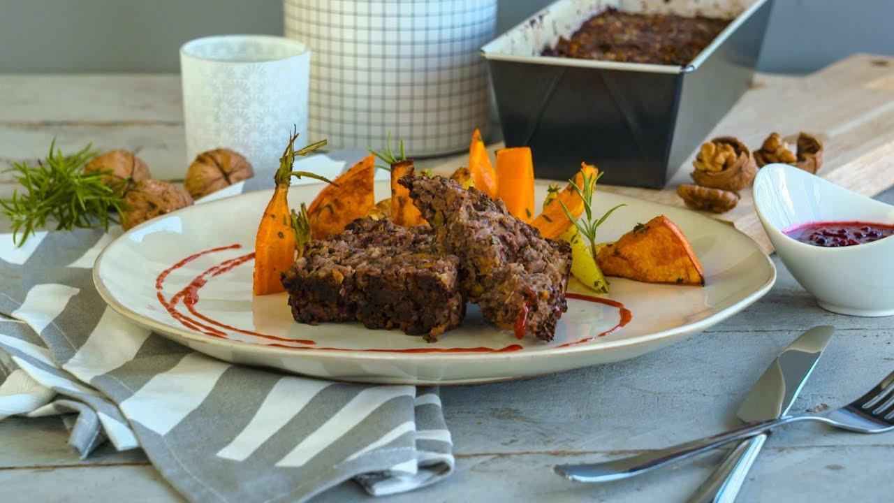 - Nussbraten mit Ofengemüse anrichten und mit restlicher Preiselbeerkonfitüre servieren.