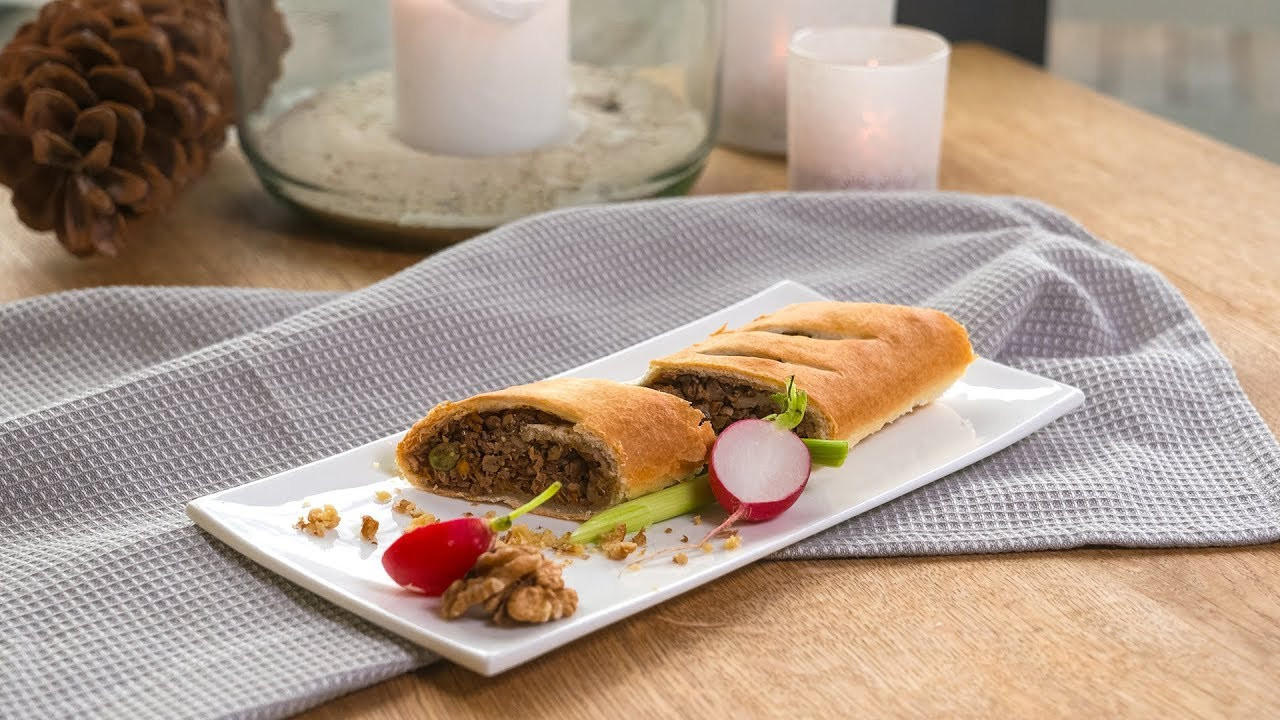 - Den fertigen Blätterteig ausbreiten. Die Füllung in der Mitte des Rechtecks in einem Strang verteilen, dabei oben und unten einen kleinen Rand lassen. Die Seitenränder mit Sojadrink bestreichen, die langen Seiten über klappen und andrücken, die schmalen Ränder andrücken. Mit einem scharfen Messer schräge Schlitze in die Oberfläche des Strudels schneiden. Den Strudel mit Sojadrink bestreichen.