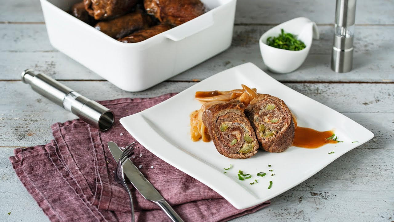 Für eine alternative Füllung können Sie anstelle von Gewürzgurken und Speck, blanchierte Spinatblätter und Feta in die Roulade einrollen. Durch die Zugabe von Basilikum, Oregano und Thymian in der Soße erhält das Gericht eine mediterrane Note.