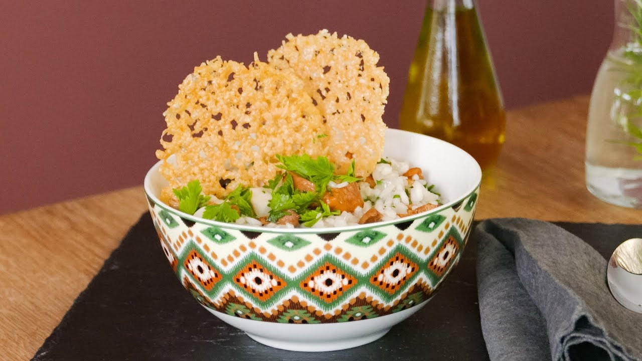 Wie bereitet man One-Pot-Pilzrisotto mit Parmesanchips zu?