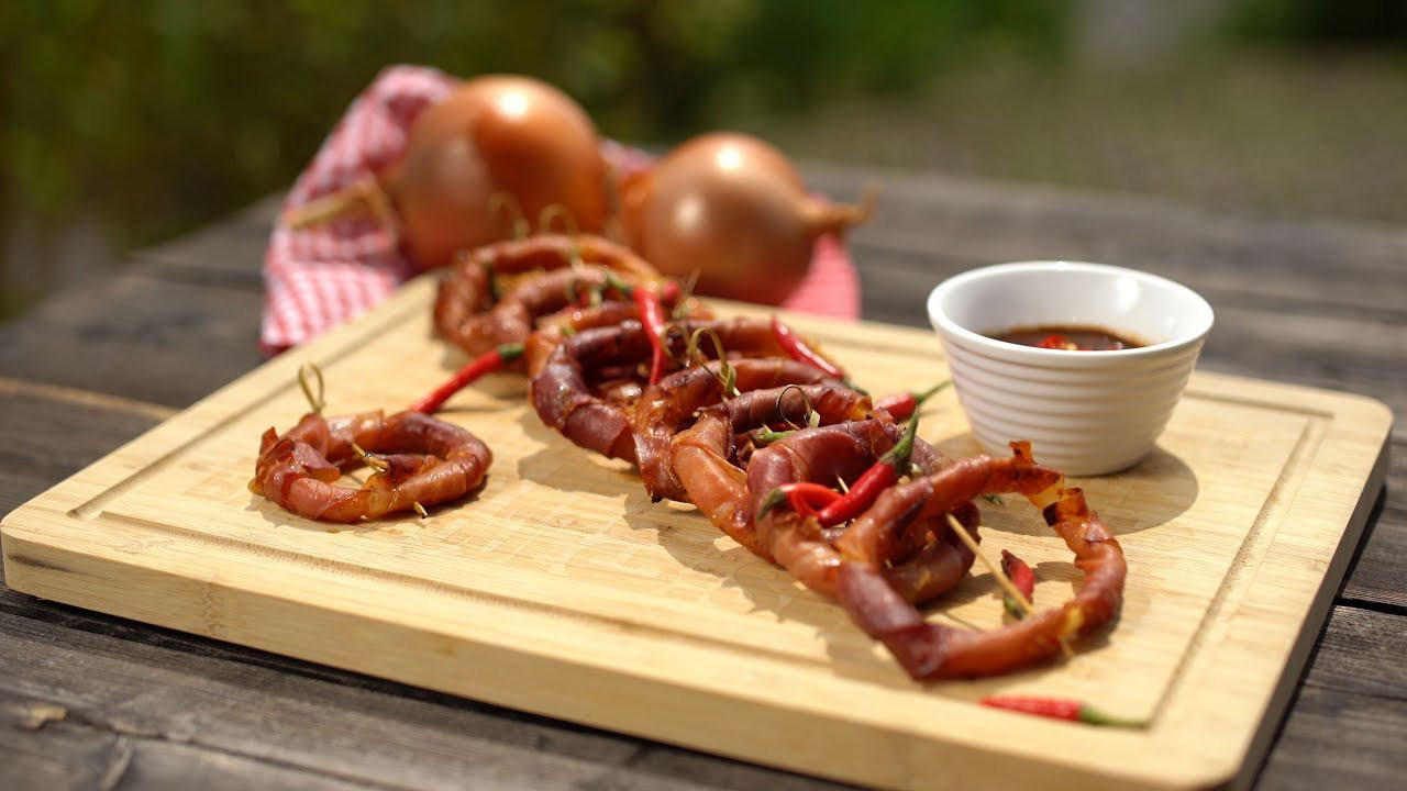 Wie bereitet man Onion-Rings mit luftgetrocknetem Schinken?