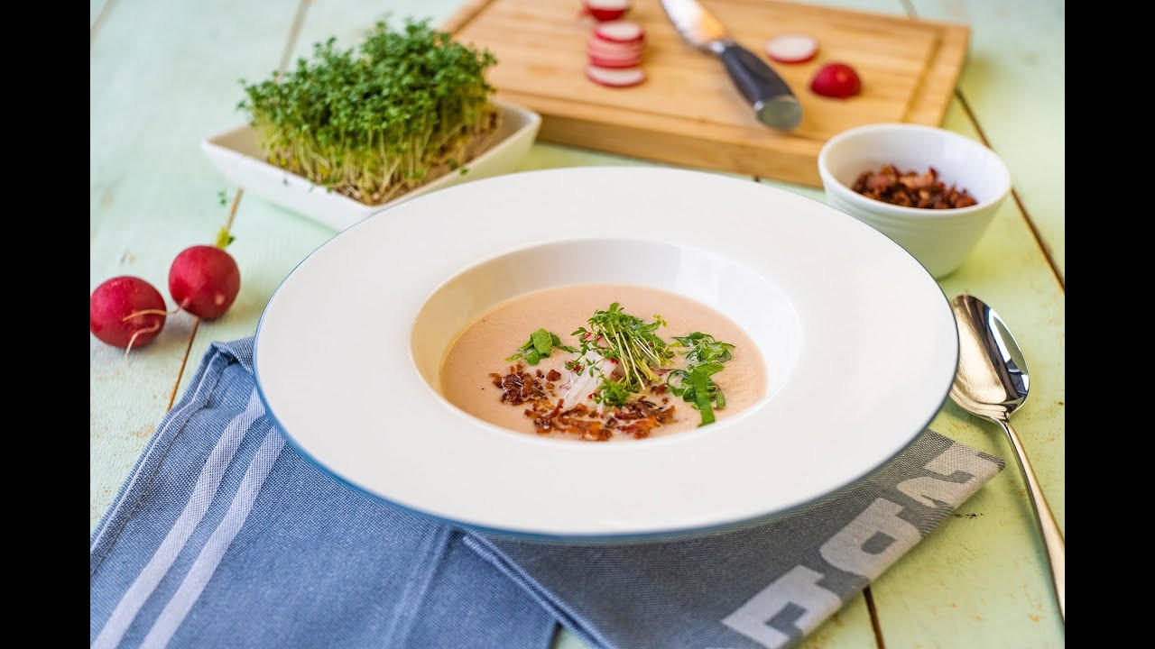Wie bereitet man Radieschensuppe mit knusprigem Bacon zu?