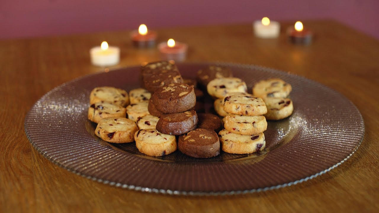3 cm) formen und in etwas Frischhaltefolie einwickeln. Für 1 Stunde in das Gefrierfach legen. - Den Backofen auf 180 °C Ober-/Unterhitze vorheizen. Backbleche mit Backpapier auslegen. Mit einem scharfen Messer etwa 1 cm dünne Scheiben von den Teigrollen abschneiden. Mit etwas Abstand auf die Backbleche legen und im heißen Ofen nacheinander etwa 12 Minuten backen, bis die Ränder leicht braun sind. Aus dem Ofen nehmen und auf einem Kuchengitter vollständig abkühlen lassen.