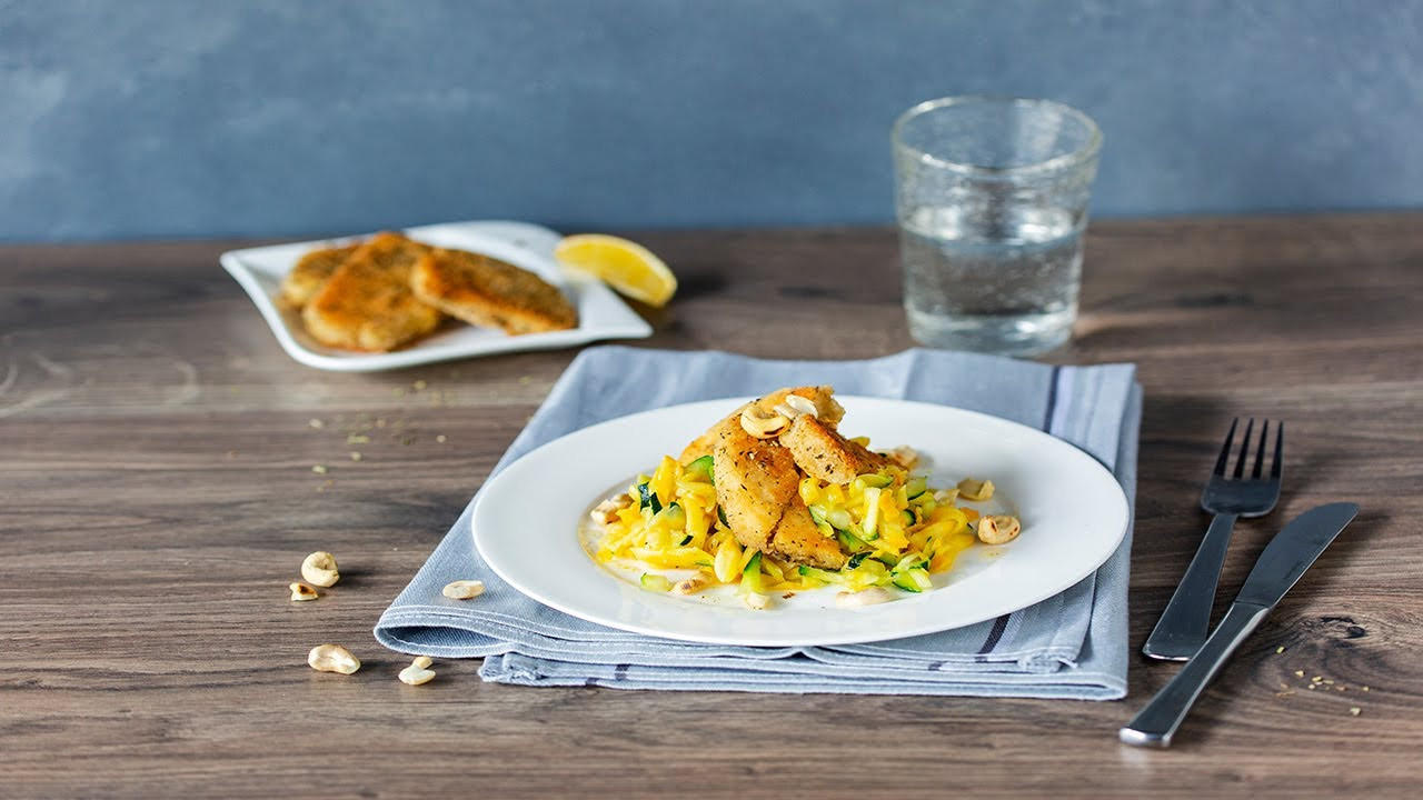 Roher Zucchinisalat mit paniertem Halloumi und Zitronendressing