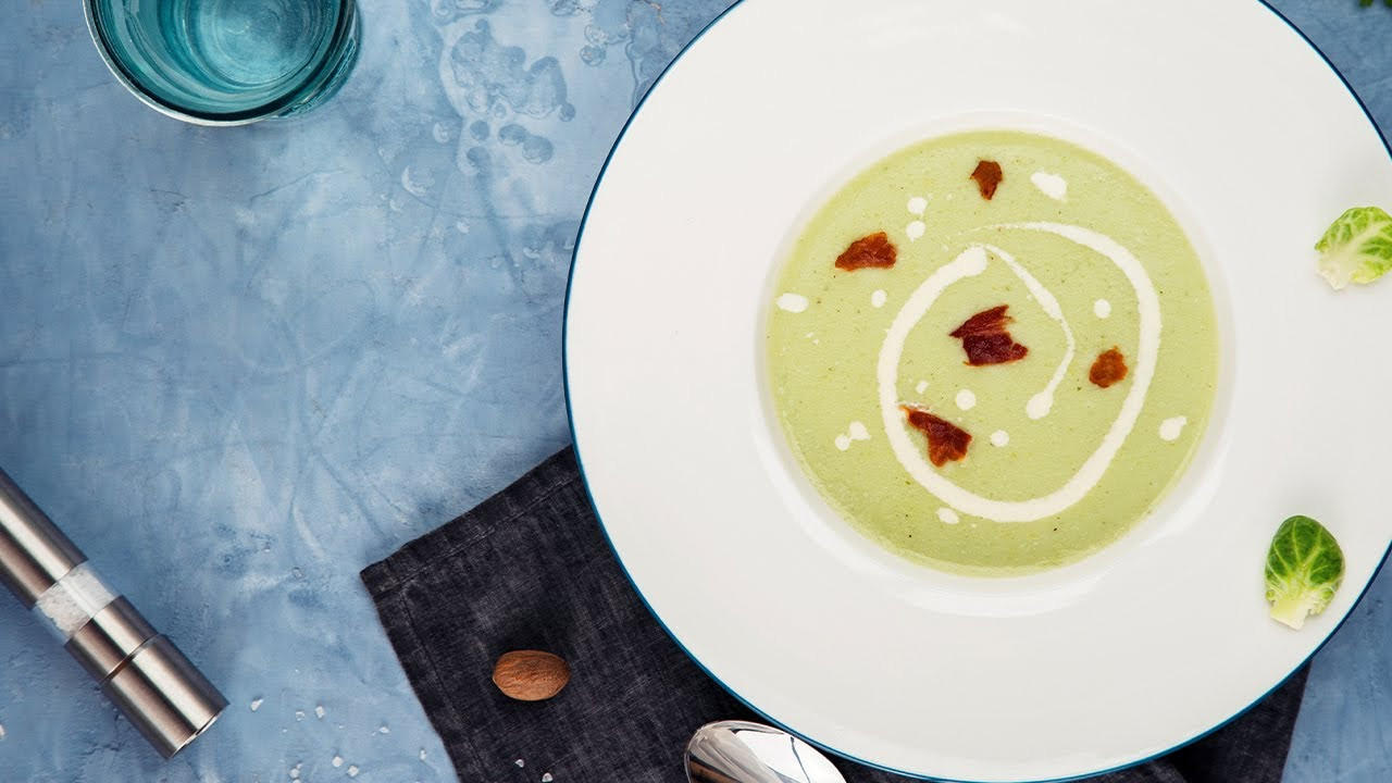 Wie bereitet man Rosenkohlcremesuppe mit Speckchips zu?