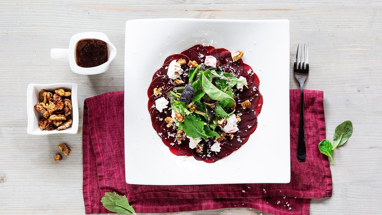 Wie bereitet man Rote Bete-Carpaccio mit Ziegenkäse und Walnusscrunch zu?