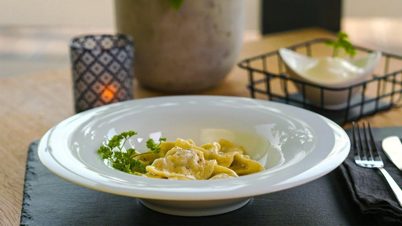 - Den Nudelteig dünn ausrollen und mit einem runden Ausstecher oder einem Glas Kreise ausstechen (ca. 6 cm Durchmesser). Mit einem Teelöffel jeweils etwas Hackfleischmasse auf den Kreis geben, die Ränder mit Eiweiß bestreichen und umklappen. Den Rand gut andrücken und die Ecken zusammenkleben.