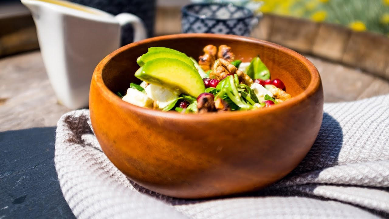 - Den Feldsalat waschen und verlesen. Die Avocado halbieren, den Kern entfernen und das Fruchtfleisch herauslösen. Avocado in dünne Scheiben schneiden. Den Feta würfeln. Die Walnüsse in einer Pfanne ohne Öl leicht anrösten. Die Kerne aus dem Granatapfel lösen.