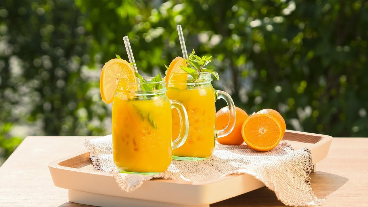 - Den kalten Tee mit Mangosaft und Sanddornsaft verrühren. Crushed Ice, ein paar Orangenspalten und Minzblätter in die Gläser geben und den Eistee einfüllen.