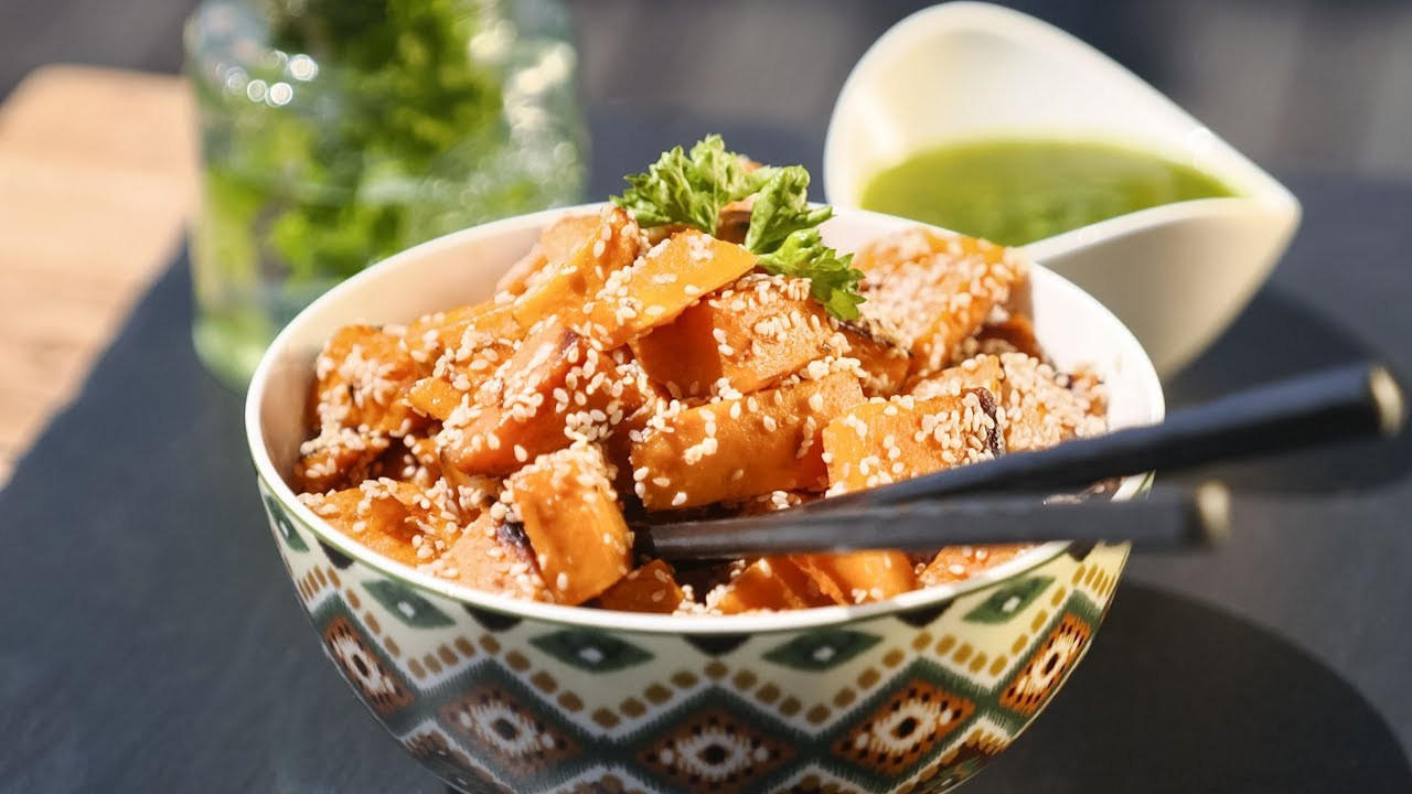 Wie bereitet man Sesam-Süßkartoffelwürfel mit grüner Mojo zu?