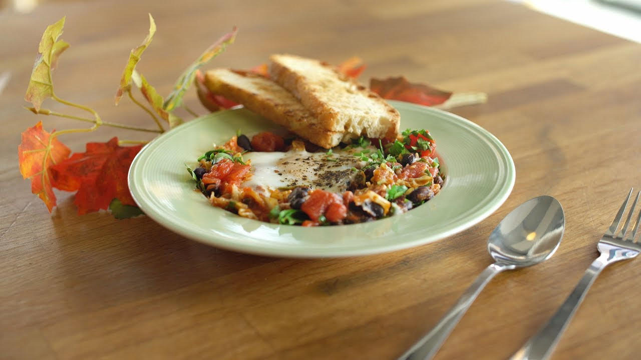 - In einer ofenfesten Pfanne das Öl erhitzen. Zwiebel, Knoblauch und Wirsing zugeben und unter Rühren 5 Minuten andünsten. Kreuzkümmel und Chilipulver zugeben und kurz mit andünsten. Mit den gehackten Tomaten und Bohnen ablöschen und aufkochen. Mit Salz und Pfeffer würzen und alles etwa 5 Minuten zugedeckt köcheln lassen.