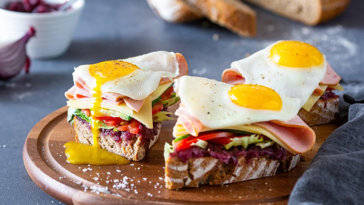 - Zum Anrichten, das Brot in Scheiben schneiden. Mit Chutney bestreichen und mit Salatblättern, Tomate, Gurke, Bergkäse und Leberkäse belegen. Zum Schluss mit den Spiegeleiern toppen.