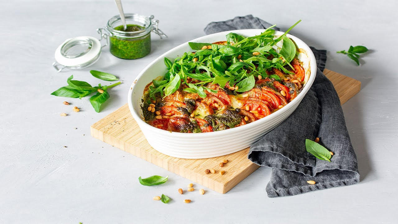 3. Für den Auflauf Tomaten waschen und in 0,5 cm dicke Scheiben schneiden. Mozzarella abtropfen lassen und in dünne Scheiben schneiden. Anschließend mit Pesto bestreichen.