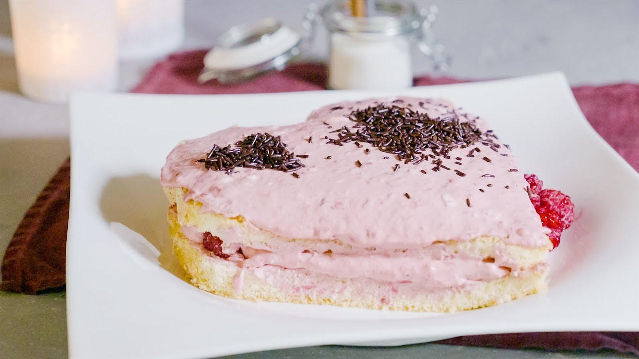 - Den Kuchen mit dem Rest der Creme oben einstreichen. Als Dekoration eine kleine Herzausstechform vorsichtig auf die Sahne setzten und das Herz mit Schokostreuseln ausfüllen, die Form vorsichtig entfernen. Nach Belieben weitere Schokostreusel-Herzen auf der Torte verteilen. Bis zum Verzehr kühl stellen.