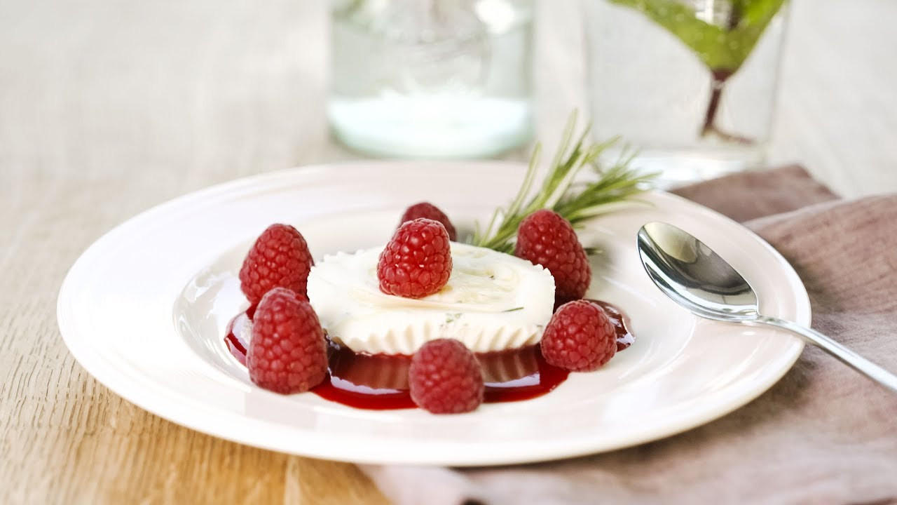 - Auf einem flachen Teller dekorativ die Himbeersoße verteilen. Die PapierMuffin-Förmchen von den Eistörtchen lösen. Die Eistörtchen auf der Himbeersoße anrichten und mit Himbeeren und Rosmarin garnieren.