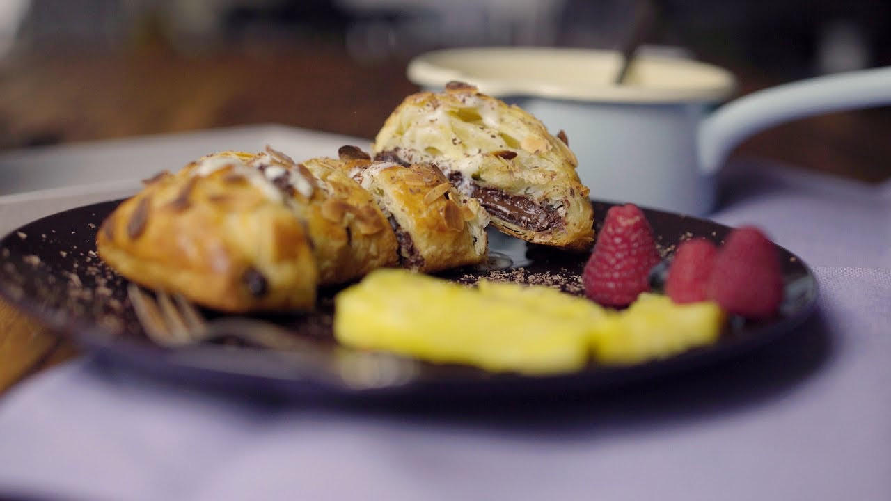 1. Teig ausrollen. Schokolade in die Mitte setzen und den Teig diagonal links und rechts einschneiden. Den überstehenden Teig an den Ecken entfernen. Die Teigstreifen von oben beginnend einfalten.