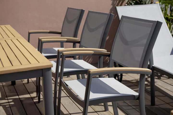 Freunde des Natur-Stils entscheiden sich für Stühle komplett aus Holz. Zur Auswahl stehen neben Teak auch Bambus oder geöltes Eukalyptusholz. Auf einer puristisch-trendig gestalteten Terrasse macht hingegen ein schwarzer oder hellgrauer Aluminium-Gartenstuhl mit Netzbespannung, der modisch auftritt, eine exzellente Figur. Eine Kombination aus Metall, beispielsweise Edelstahl, und Holz versprüht durch den Materialmix ebenfalls geschmackvolle Ästhetik im Außenbereich. Wer bunte Akzente setzen möchte, wählt Terrassenstühle, die mehrfarbig und stapelbar sind. Solche Modelle in Rot, Grün oder Blau werden zum Blickfang neben dem Tisch und wecken aufgrund der freundlichen Töne die gute Laune.