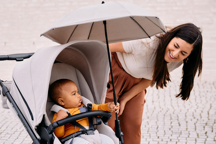Sonnenschutz: Wer einen Kinderwagen um Zubehör für den Sommer erweitern will, der sollte auf einen kompakten Sonnenschirm nicht verzichten. Die meisten Modelle lassen sich mit einer Klemme leicht am Rahmen anbringen. Alternativ können Sie sich für ein Sonnensegel entscheiden, das am Verdeck befestigt und über dem Wagen aufgespannt wird. Etliche Varianten haben übrigens einen ausgewiesenen Lichtschutzfaktor, der Auskunft über den Schutzgrad gibt.