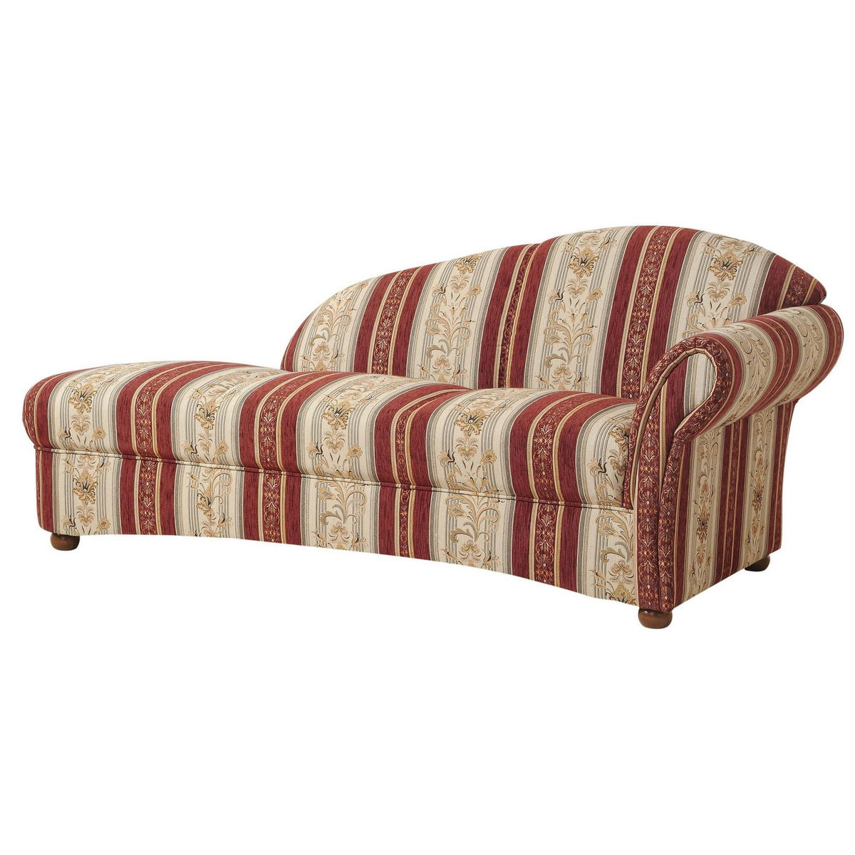 Vollpolsterrecamiere mit Chatosenseitenteil im Landhausstil. Romantisch verspielt gibt diese wunderschöne Recamiere dem Raum eine besondere Note. Das Streifenmuster unterstreicht den wohnlichen Akzent. Die dunklen Buchefüße runden das Gesamtbild ab. Der Rücken ist mit Originalstoff bezogen, somit ist die Recamiere frei im Raum stellbar. Die Füße sind zur einfachen Selbstmontage.