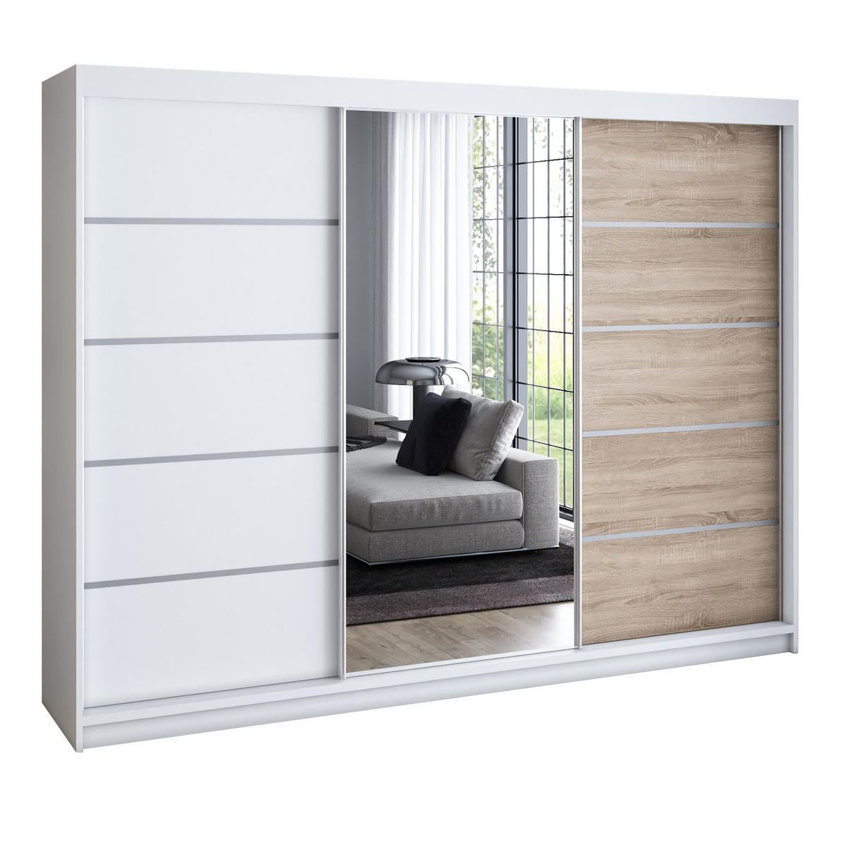 A&J MöbelLand SCHWEBETÜRENSCHRANK 200 cm VILUNO 1 Farbe: Weiß, Weiß, Sonoma